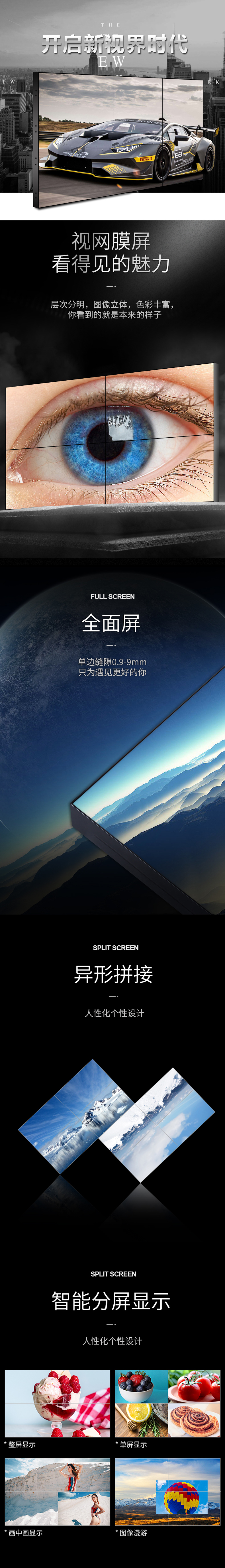 65英寸3.5mm液晶拼接屏應具有極高分辨率、可調亮度和對比度、范圍寬,色彩還原真實,圖像失真小,亮度均勻,顯示清晰,系統操作簡單,維護方便,使用壽命長。65英寸超窄邊液晶拼接屏,既能單獨作為顯示器使用,又可以拼接成超大屏幕使用。根據不同使用需求,實現可變大也可變小的百變大屏功能:單屏分割顯示、單屏單獨顯示、任意組合顯示、全屏液晶拼接、雙重拼接液晶屏拼接、豎屏顯示,圖像邊框可選補償或遮蓋,支持數字信號的漫游、縮放拉伸、跨屏顯示,各種顯示預案的設置和運行,全高清信號實時處理。