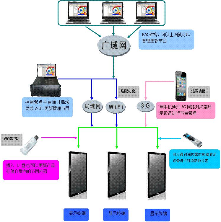 多種網(wǎng)絡(luò) 方便實(shí)用 支持局域網(wǎng)、廣域網(wǎng)等組網(wǎng)方式,終端可通過(guò)LAN、WIFI、WLAN、3G網(wǎng)絡(luò)鏈接入網(wǎng),滿(mǎn)足有線無(wú)線聯(lián)網(wǎng)需求;無(wú)網(wǎng)絡(luò)時(shí),將做好的節(jié)目通過(guò)U盤(pán)也能更新 |